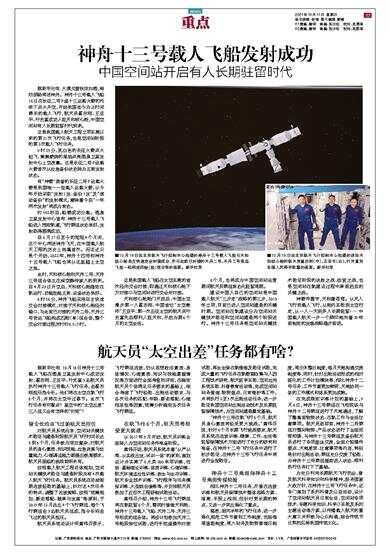 据新华社电 10月16日神舟十三号载人飞船在酒泉卫星发射中心成功发射,翟志刚、王亚平、叶光富3名航天员执行神舟十三号载人飞行任务,由翟志刚担任指令长。他们将在太空在轨飞行6个月,并将在太空中过春