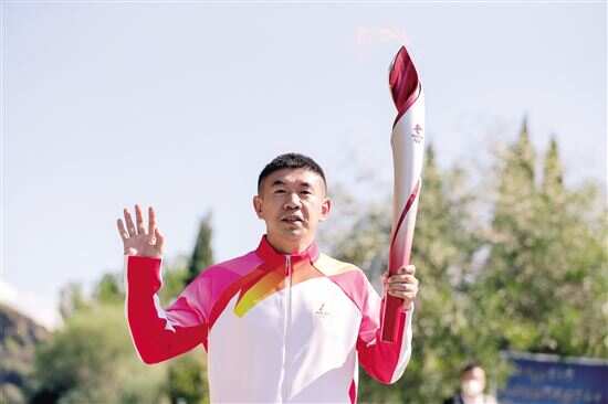 ■前中国短道速滑运动员李佳军手持北京冬奥会火炬“飞扬”在火种采集成功后传递。