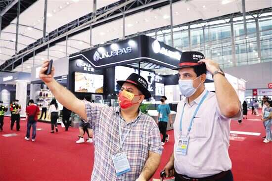 ■拿订单、拓市场、创品牌,广交会向来是国内外企业们共享中国发展成果的重要平台。图为两位巴勒斯坦采购商在新能源专区自拍合影。 新快报记者 孙毅/摄 |