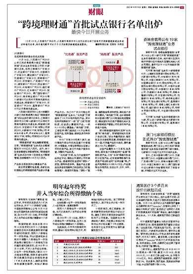 最快今日开展业务 10月18日,人民银行广州分行、人民银行深圳市中心支行分别公布了首批可开展跨境理财通业务试点的银行名单,相关银行最早可以于今日开始提供跨境理财通服务。■新快报记者 范昊怡