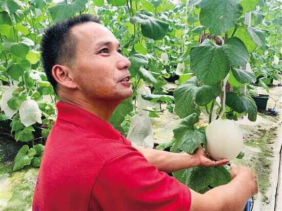 ■正在摘冰淇淋蜜瓜的陆国建告诉记者,在家门口的示范园工作,夫妻俩每个月有7000多元。 |