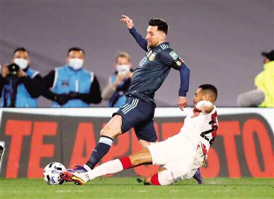 ■10月14日,在2022年卡塔尔世界杯南美区预选赛中,阿根廷队球员梅西(左)和秘鲁队球员卡朗拼抢。新华社发 |