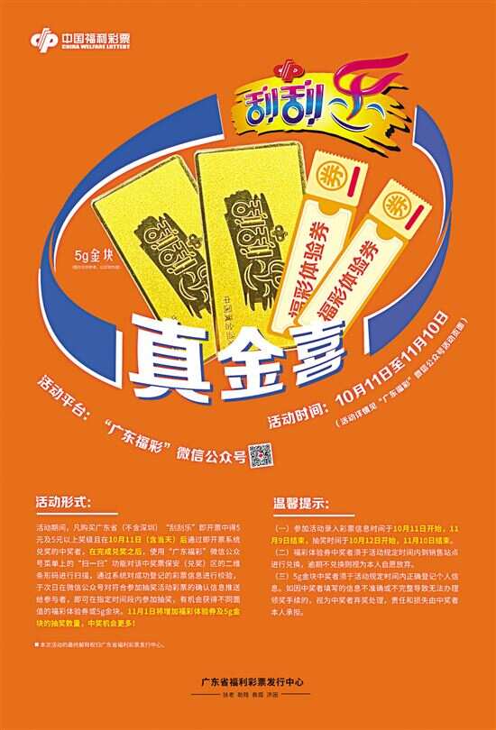 新快报讯 记者陆妍思 通讯员梁一鸣报道 广东福彩“刮刮乐真金喜”营销活动在全省吹起刮彩旋风。10月15日下午,江门福彩销售员微信沟通群热烈讨论着两大活动的市场反响,纷纷晒出本站点彩民中奖派奖的情况及自己参加抽奖获体验券的战果,44122637投注站负责人李福权上传三张图片,其中一张显示中出5g金块。 活动首周江门中7个金块 据李福权介绍 ,他当天下午参加抽奖,锦鲤附体“指动金来”,在连续抽中多张5元购彩体验券后随机一按,幸运转盘指针停在5g金块区域,随后便收到广东福彩推送的信息,通知他获得金块的中奖结果。李福权马上在群里分享中得金块消息,意在鼓励大家积极参与登记参与抽奖。 李福权说,他的站点有很多刮刮乐忠实粉丝,原因要追溯至5年前——2016年10月18日,站里一位彩民在参加“头奖翻倍等你拿 一刮千金好运来”营销活动时,刮出一等奖30万元再获广东福彩奖金翻倍奖励,共收获60万元奖金。当时站内不少顾客都见证了中奖的场景,喜讯一传十、十传百,刮刮乐即开票就越来越受该站点彩民欢迎。 “这次的‘真金喜’活动力度很大,更加激发大家的刮彩热情。”李福权表示,在销售刮刮乐前和彩民兑完中奖奖金后,他都会力荐彩民参与登记抽奖活动。彩民也会放心地把一些中奖彩票赠送给他登记,集合一起就有相当数量的抽奖资格,每天参加抽奖都能收获福彩体验券的奖励。 据广东省福彩中心公布,10月15日江门有5人喜获金块,16日、17日两天各有1位彩民抽中金块,活动首周江门共登记中得7个金块,数量名列全省第5位。 共将送出504个5g金块 据了解, 10月11日起,彩民购买广东省内(不含深圳)销售的刮刮乐即开票中得5元及5元以上奖级,兑奖后登录“广东福彩”微信公众号,使用菜单上的“扫一扫”功能对该中奖彩票保安(兑奖)区的二维条形码进行扫描登记,即可于翌日10:00-22:00参加抽奖。10月12日至11月10日每天送出18500张福彩体验券和16个5g金块,其中11月1日当天更增加9000张福彩体验券和24个5g金块进行抽奖。整场活动将送出56.4万张总值290万元的福彩体验券和504个5g金块。 中得福彩体验券的中奖者,须于2021年11月15日20时前到全省(不含深圳)任一福利彩票销售站点兑换与体验券等额的在售“刮刮乐”即开型福利彩票,每张福彩体验券仅可兑换一次。中得5g金块的中奖者,需于2021年11月15日20时前登录“广东福彩”微信公众号指定页面登记个人信息,如因中奖者填写的信息不准确或不完整导致无法办理领奖手续的,视为中奖者弃奖处理。成功登记个人信息的中奖者,将由中奖者填写领取所属的市福彩中心负责通知领取。 提醒彩民的是,新上市的“正当红”玩法,除了可参与“刮刮乐真金喜”活动外,还可参与全国范围的2亿元派奖活动,即日起至11月11日活动期间,对单张彩票兑取“正当红”游戏头奖100万元、200元、100元、30元奖等的购彩者进行派奖。其中100万元奖等的派奖金额为100万元;其他三个奖等的派奖金额为相应设奖金额的50%,具体为:兑取100万元的中奖者,派送100万元固定奖金;兑取200元、100元、30元的中奖者,分别派送100元、50元、15元固定奖金。