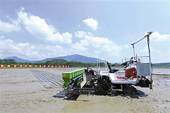 ■清远市携手华南农业大学试点建立的粤北首个“花稻花”无人农场直播启动。一辆无人点播机开到田里开始水稻播种。 |