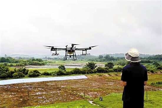 ■增城区派潭镇高埔村的南方优品丝苗米基地开秧活动现场,多台农业无人机在空中盘旋,进行播撒作业。 |