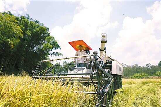 ■廉江市良垌镇新圩村,良垌兴旺农业专业合作社在水稻种植基地利用农用机械化收割服务。 |