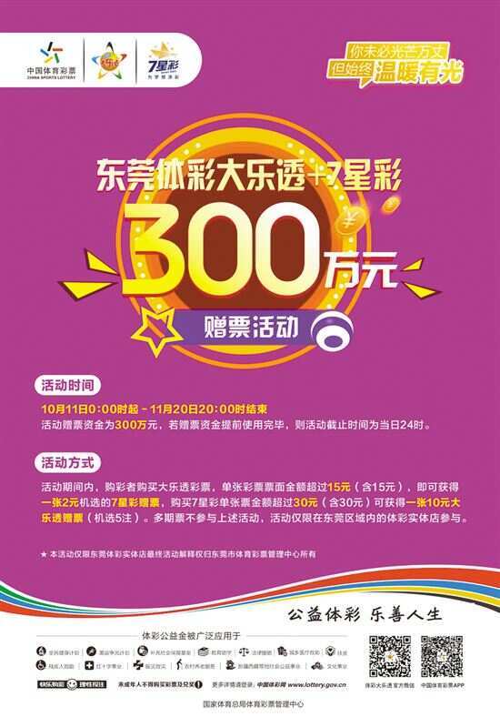 新快报讯 记者陆妍思报道 自2021年10月11日东莞体彩开展300万元赠票活动启动后,广受购彩者的欢迎,截至10月19日,赠票金额已送出565634元。 活动时间从2021年10月11日00∶00起至2021年11月20日20∶00,购彩者在这期间购买大乐透彩票,单张彩票票面金额超过15元(含15元),即可获得一张2元机选的7星彩赠票;购买7星彩单张票金额超过30元(含30元)可获得一张10元大乐透赠票(机选5注)。本次活动赠票资金为300万元,若赠票资金提前使用完毕,则活动截止时间为当日24时。 多期票不参与上述活动,活动仅限在东莞区域内的体彩实体店参与。