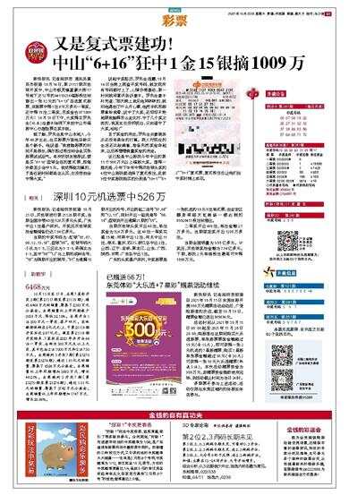 新快报讯 记者陆妍思 通讯员黄英杰报道 10月14日,第21117期双色球开奖中,中山市板芙镇富豪大街17号地下之12号的44110216福彩投注站售出一张32元的“6+16”自选复式彩票,该彩