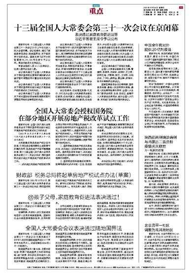 全国人大常委会授权国务院 在部分地区开展房地产税改革试点工作
