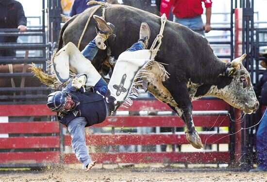 10月23日,一名牛仔在骑牛竞技赛中从牛背跌落。