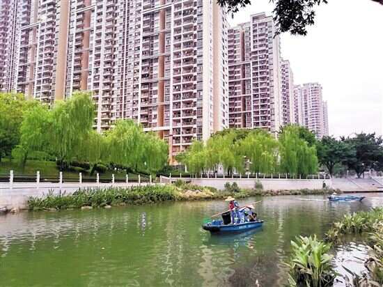 ■广州天河区的水上环卫工人驾着小船,在河涌里认真作业。