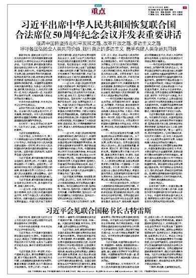 习近平出席中华人民共和国恢复联合国合法席位50周年纪念会议并发表重要讲话