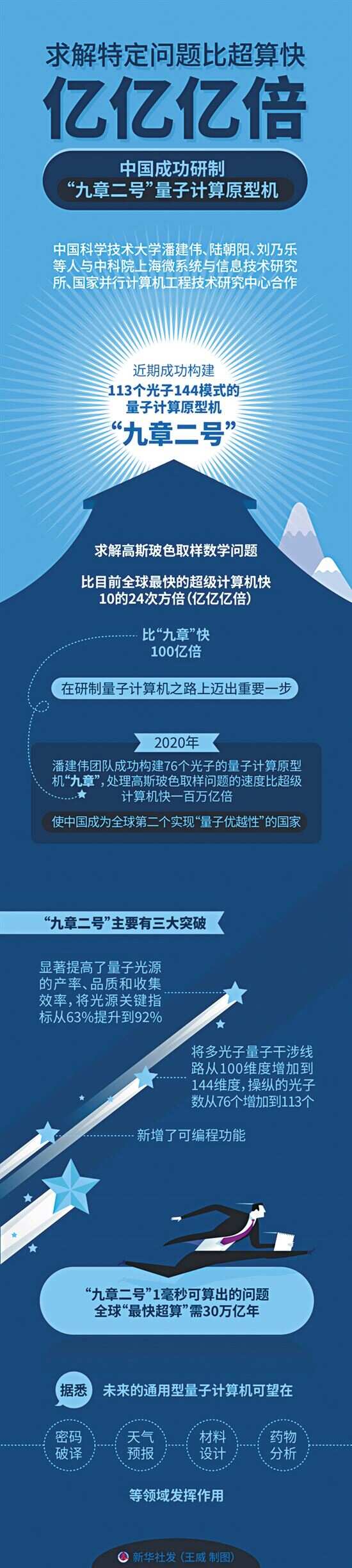中国成功研制“九章二号”量子计算原型机 据新华社电 记者从中国科学技术大学获悉,该校潘建伟、陆朝阳、刘乃乐等人与中科院上海微系统与信息技术研究所、国家并行计算机工程技术研究中心合作,近期成功构建113个光子144模式的量子计算原型机“九章二号”,求解高斯玻色取样数学问题比目前全球最快的超级计算机快10的24次方倍(亿亿亿倍),在研制量子计算机之路上迈出重要一步。 “我们主要有三大突破,首先显著提高了量子光源的产率、品质和收集效率,将光源关键指标从63%提升到92%。其次,将多光子量子干涉线路从100维度增加到144维度,操纵的光子数从76个增加到113个。第三,新增了可编程功能。”研究团队成员、中科大教授陆朝阳说。 结果显示,“九章二号”的算力实现巨大提升。根据目前已发表的最优经典算法,“九章二号”求解高斯玻色取样问题的处理速度,比全球最快的超级计算机快亿亿亿倍,比“九章”快100亿倍。“九章二号”1毫秒可算出的问题,全球“最快超算”需30万亿年。 10月25日,国际权威学术期刊《物理评论快报》发表了该研究成果。据悉,未来的通用型量子计算机可望在密码破译、天气预报、材料设计、药物分析等领域发挥作用。目前的“九章二号”还只是“单项冠军”,但其超强算力,在图论、量子化学等领域具有潜在应用价值。 成功研制“祖冲之二号”! 中国在两条技术路线上实现“量子优越性” 据新华社电 记者从中国科学技术大学获悉,该校潘建伟、朱晓波、彭承志等组成的研究团队与中科院上海技术物理研究所合作,近期成功构建66比特可编程超导量子计算原型机“祖冲之二号”,求解“量子随机线路取样”任务的速度比目前全球最快的超级计算机快1000万倍以上,这使得中国成为目前唯一在两条技术路线上达到“量子优越性”里程碑的国家。 “达成‘量子优越性’,标志着我们的研究进入第二阶段,开始量子纠错和应用探索。”朱晓波介绍,“祖冲之二号”的并行高保真度量子门操控能力和完全可编程能力,有望找到有实用价值的应用,预期包括量子机器学习、量子化学等。 10月25日,国际学术期刊《科学通报》和《物理评论快报》发表了该成果。