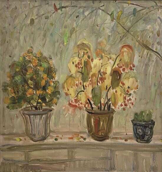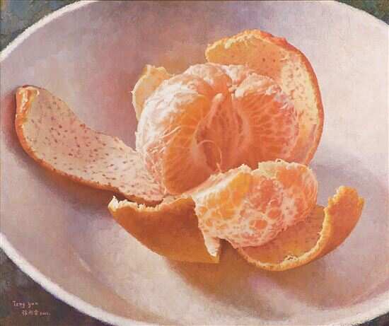 ■梁器奇《小鸟枝头唱海棠》,布面油画, 1999年 |