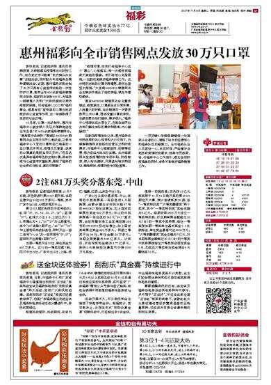 新快报讯 记者陆妍思 通讯员李娜报道 为积极落实疫情常态化防控工作,结合党史学习教育“我为群众办实事”实践活动,同时配合年底福彩各票种营销活动,近期,惠州福彩采购定制了30万只具有公益宣传功能的