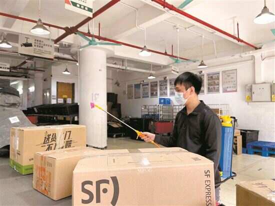 ■顺丰速运中环广场营业部的工作人员正在对快件进行消杀。 |