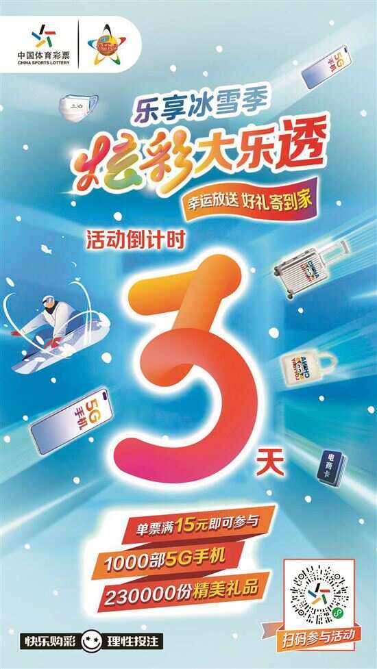这是大乐透近年首次年终开展全国性回馈活动 迎接冬奥会,为运动健儿加油喝彩,超级大乐透将于11月20日开启“乐享冰雪季 炫彩大乐透”幸运派送活动,这也超级大乐透近年首次于年终开展全国性回馈活动,为大家准备了手机、体彩定制周边以及电商卡等超值好礼,各省市的福利活动也是接连不断为惊喜加码。 ■新快报记者 陆妍思 追加助力邂逅大奖惊喜 作为彩票界“航母级”游戏,超级大乐透一直以“大奖大,小奖多”的特点备受购彩者喜爱,至今已累计开出一等奖超6000注,单注最高奖金达3600万元(派奖期间),二等奖和固定奖更是数不胜数,为广大购彩者带去了看得见的惊喜。广受好评的“追加投注”,早已成为购彩者口中的“揽奖利器”,在2元1注基本投注的基础上,每注多花1元钱进行追加投注,中得一、二等奖时就可多得80%的奖金。让购彩者以更少的花费,收获更多期待和欢乐,这是超级大乐透独有的投注方式,也是倡导理性购彩理念的实际行动。 上市14年间在追加投注的助力下超级大乐透创造了19个亿元大奖,不断打破纪录,为彩市发展注入了源源不断的生机和活力。 随手公益汇聚磅礴力量 超级大乐透是筹集彩票公益金的“主力军”,每购买一注2元超级大乐透,就能贡献0.72元彩票公益金。上市14年来,大乐透累计销量超3300亿元,累计筹集公益金超1100亿元。无数个0.72元,汇聚了磅礴的公益力量,不仅为众多购彩者的日常生活增添了更多精彩,也为社会公益事业、体育事业的发展,贡献着自己的一份力量。 爱可以被分享,幸运也可以被传递。四川省成都市1.72亿元得主,为医疗救助机构捐出1000万元时说:“我因为身体不好常去医院,特别同情很多人看不起病,以前没这个能力帮助别人,现在有能力了一定要实现愿望,以后还会尽力帮助需要帮助的人。” 还有很多中得超级大乐透大奖的幸运儿都选择主动捐出部分奖金,回馈社会、支持公益事业,让公益的力量惠及更多人,也让我们看到了善意的温暖。