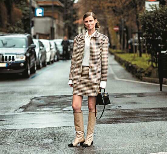 如果不想套装穿出过于“一脸正经”,可将下装替换成长靴来增加造型的硬朗利落感。 |