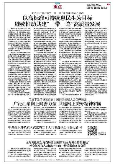 习近平在第三次“一带一路”建设座谈会上强调 据新华社电 中共中央总书记、国家主席、中央军委主席习近平19日在北京出席第三次“一带一路”建设座谈会并发表重要讲话强调,完整、准确、全面贯彻新发