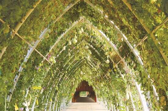 ■在广州市南沙区明珠农业园,这条520米长,由果、藤、瓜、花织就的绿廊是游客最爱的打卡地之一。新快报记者 孙毅/摄