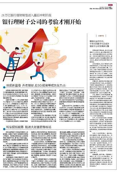 挖掘新蓝海 养老理财、ESG投资等成为发力点 在净值化转型冲刺的同时,银行理财子不断挖掘新蓝海、寻找财富管理新方向,优化产品结构,如布局ESG(环境、社会责任与公司治理)投资、养老理财、科