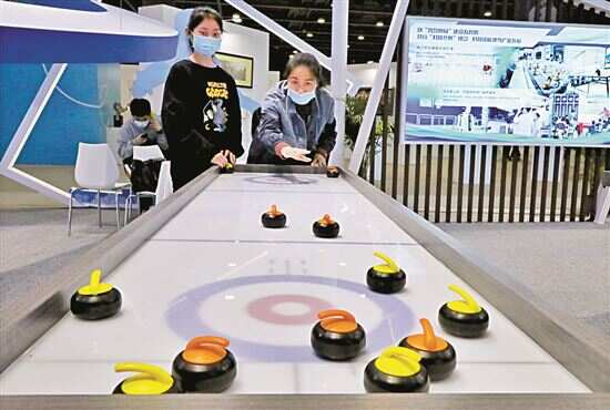 ■北京奥林匹克公园展位,市民在体验冰壶小游戏。 |