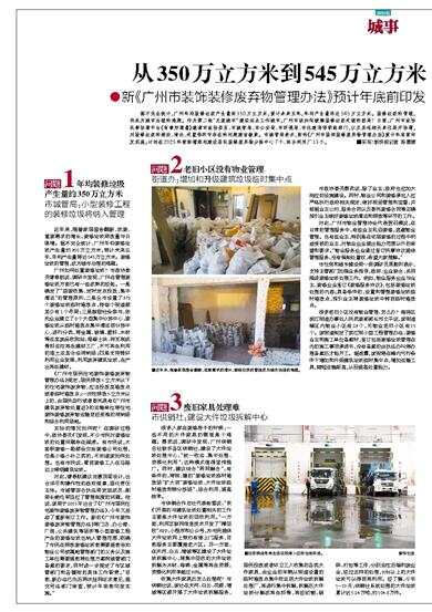 ●新《广州市装饰装修废弃物管理办法》预计年底前印发 ●2025年前广州将新增7个居民装修废弃物分拣中心 据不完全统计,广州年均装修垃圾产生量约350万立方米,预计未来五年,年均产生量