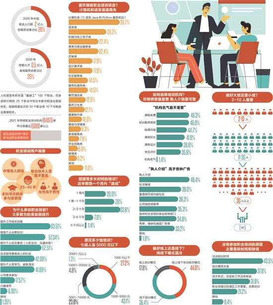 一个月速成、5000元以下 随着互联网技术,5G技术和视频技术的发展以及移动通信设备的普及,职场人可以随时随地在线学习,为职业培训营造了成熟的技术环境。此外,在很多岗位中,因为岗位的特殊性、专业性或者具有一定难度,没有办法获取系统完整的知识,职业培训市场就为此提供了很大的便利。 最新调查显示,超过六成用户参与培训是为了提升工作相关技能,超五成是为了提高个人业务知识和提升个人综合素质,此外超四成用户为了提升个人竞争力、追求获得高收入的机会。分析师认为,中国消费者个人能力提升及职业技能提升需求明显,推动了职业培训市场的繁荣,同时职业培训目的多元,也使得职业培训市场更加垂直细分发展。据艾媒咨询《2021年中国职业培训市场研究报告》预计,到2021年中国职业培训市场将达到2310.5亿元,同比增长10.7%。 技术人才紧缺 职业培训受资本追捧 社会经济发展迅速,需要大批创新型、技能型的人才,尤其是在新一代信息技术、电力装备、新材料等领域。据教育部、人社部、工信部联合发布的《制造业人才发展规划指南》显示,2020年制造业十大重点领域人才缺口超过1900万人,2025年将接近3000万人。 因此,2020年《政府工作报告》提出,2020-2021年两年期间职业技能培训需达到3500万人次以上。另一方面,“毕业即失业”成为大学生踏入社会的第一道难关,也催生了“毕业后教育”概念的流行,推动市场快速发展。 就业压力的增大,促使人们寻求职业培训课程服务,通过提升自我,缓解就业压力带来的焦虑,这种情况将进一步推动职业培训市场快速发展。数据证明,这个领域的赛道日趋火热,市场正在用钱包投票。亿欧智库《2021新职业教育行业发展研究报告》显示,截至11月,2021年已有云学堂、UMU 互动学习平台、课观教育、三节课等多家职业教育相关企业获得多轮融资,职业教育融资事件中,A轮融资和并购项目数量最多超过行业整体的三分之一,而从细分的投资方向来看,企业培训类企业在今年的融资较多,IT、招录考试、财商和医学类赛道也是资本市场较为活跃和关注的领域。 《证券时报》也在12月2日发布的报道称,截至2021年11月29日,今年以来职业教育培训领域的融资额超过过去两年的融资综合,创下历史新高。 职业培训对优化人才结构的效果已经显现。据中国教育科学研究院发布的《2020中国职业教育质量年度报告》,2019年全国高职院校面向社会成员的培训到款额超过50亿元,较2018年增长了将近20%,其中300余所院校的培训到款额超过500万元,170余所院校超过1000万元,60余所院校超过2000万元。开展新型职业农民培训服务的总规模超过300万人,开展退役军人培训服务的规模超过170万人。广东省教育厅编制的《广东省高等职业教育质量年度报告(2021)》中也提到了今年“粤菜师傅”“南粤家政”“广东技工”三大工程,年培训了“粤菜师傅”1万人,年培养“南粤家政”人才2.5万人。 ■策划:罗韵 ■统筹:梁彧 ■采写:新快报记者 罗韵 ■制图:廖木兴