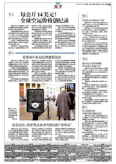 头条 据新华社电 英国媒体13日报道,随着圣诞节需求猛增,全球航空货运价格上涨至创纪录水平。 英国《金融时报》报道,中国上海至北美航线空运价格上周首次达到每公斤14美元。这一价格在8