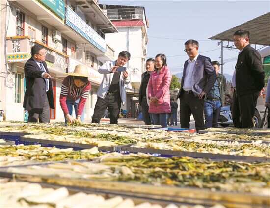 ■在丰乐蔬菜种植农民专业合作社,袁辉明一行仔细了解菜干制作过程和包装等情况。 |