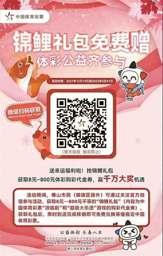 新快报讯 记者陆妍思 通讯员佛山体彩报道 为感谢广大购彩者对体彩公益事业的支持,践行中国体育彩票“多人少买”的购彩理念,佛山体彩特开展“锦鲤礼包”活动,最高可获800元购彩代金券。 即日起至2022年5月31日,佛山市民(顺德区除外)可扫描图中二维码关注“佛山体彩”,在09:00—21:00 进入“佛山体彩”官微主页,点击菜单栏“锦鲤礼包”,点击“新人礼包”或“幸运礼包”参与活动,即可获取8元—800元不等的“锦鲤礼包”。 须注意的是,“新人礼包”需通过佛山体彩行业渠道实体店(部分销售中国体育彩票的“美宜佳”便利店)获取“活动密令”参加活动获取。“新人礼包”限新用户领取,曾参加佛山体彩“锦鲤礼包”活动并获取过锦鲤礼包的用户无法参与。“幸运礼包”可直接点击菜单栏参加活动获取。 “新人礼包”获取后的24小时内,“幸运礼包”获取后的72小时内,凭礼包到佛山市(顺德区不参与)任意体彩实体店完成核销,即可免费兑换等值指定游戏的中国体育彩票(大乐透或顶呱刮)。礼包均限一次性使用,不设找赎,不得折现,未成年人不予兑换,休市期间(以国家体彩中心公告及通知为准),活动暂停且不提供礼包核销兑换服务。逾期未核销,视为放弃礼包及其权利。