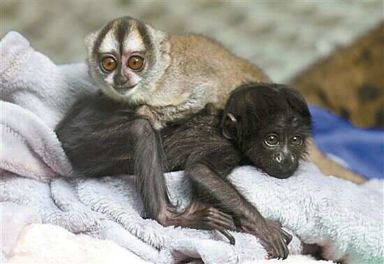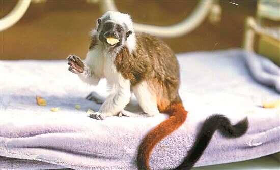 ■广州长隆野生动物世界成功繁育的极危猿猴黑丛尾猴幼崽“丛丛”(下)首次与观众见面,同时出场的还有巴西夜猴(上)和“棉顶狨”猴(小图)。新快报记者 夏世焱/摄