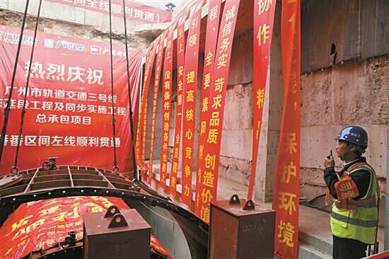 新快报讯 记者李佳文 通讯员陈虎辉 刘焕坤报道 昨日,在建地铁三号线东延段顺利完成重大工程节点:继今年9月“盾建3-1号”盾构机顺利完成掘进任务后,“盾建3-2号”盾构机也破土而出,标志着番禺广场至番禺客运站区间(下称“番番区间”)左线隧道顺利贯通,这也标志着番番区间隧道实现双线贯通,成为三号线东延段首个双线隧道贯通的区间。同日,全线最后一台盾构机“盾建3-6号”顺利实现始发,执行金光大道至广州新城西站区间左线隧道的掘进任务。 据广州地铁宣传部陈子昕介绍,三号线东延段呈东西走向,起于三号线的番禺广场站,终于四号线的海傍站,线路全长约9.58公里,均为地下敷设,共设4座车站,分别是:番禺客运站、广州新城西、金光大道和海傍(除已运营车站外,其余站名均为工程暂定名),其中海傍站与四号线换乘。列车采用与三号线一致的最高时速120公里的6节编组列车。 该线路是继七号线后第二条打通三、四号线的地铁,它着重解决亚运大道两侧及亚运城居民出行的迫切需求,有利于促进番禺东南部生活服务区的发展,支持并引导亚运城及周边区域合理布局的形成,有利于实现人口向外围城区的转移。 截至目前,全线土建工程累计完成51%。4座车站中,2座(番禺广场站、金光大道站)已封顶,2座(广州新城西站、海傍站)进行土建施工;4个区间均进行土建施工(番禺广场-番禺客运站双线已贯通),共有6台盾构机正在掘进。广州新城停车场正在进行前期准备。另外,三号线东延段首列车已于近期提前到货,广州地铁将结合三号线实际情况推进列车调试工作,争取列车早日符合上线要求。