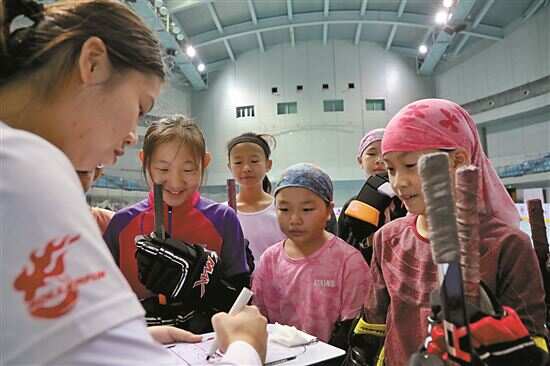戴上头盔,穿上厚厚的“战衣”,这群孩子立刻变成了全副武装的追风少年,他们挥动球杆,脚下如踩风火轮,几个急转弯,快速地拼抢、追逐着一个饼形小球——“冰球”。 |