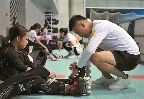 ■每次训练前,韩玥爸爸都会蹲下来帮女儿穿护具,有了父亲的疼爱和支持,韩玥这一年来进步很大。 |