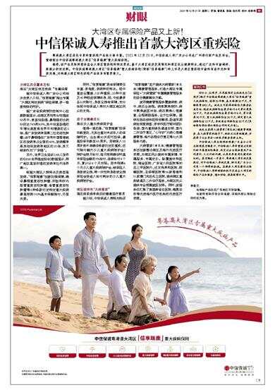 大湾区专属保险产品又上新! 粤港澳大湾区居民专享的重疾险产品线日渐丰富。2021年12月20日,中信保诚人寿广东分公司在广州举行新产品发布会,重磅推出中信保诚粤港澳大湾区“信享瑞康”重大疾病保险。 据悉,该产品是按照银保监会大湾区重疾险的特定要求,基于大湾区经济发展情况和湾区民众健康特点,通过广泛的市场调研、数据分析而定制。中信保诚粤港澳大湾区“信享瑞康”重大疾病保险(简称“信享瑞康”)的上市是大湾区重疾险市场的有益补充和有效完善,对构建大湾区特色保险产品体系有重要意义。 为湾区民众量身定制 推出“大湾区特定疾病 ”专属保障 据中信保诚人寿广东分公司相关负责人介绍,“信享瑞康”推出专属“大湾区特定疾病”保险保障,多一维度特殊的呵护。 据广东省疾病预防控制中心检测数据显示,在湾区男性和女性癌症分布中,患直结肠癌、鼻咽癌的比例分别达76%和69%,其中结直肠癌的年增长速度是世界平均增速的近2倍,是广东发病率居第二位的恶性肿瘤;由于鼻咽癌在广东和中国香港地区的发病率占全国的60%,发病概率是其他低发病率地区的20倍,其又被称作为“广东癌”。 另外,世界卫生组织IARC发布的《2020世界癌症报告》数据显示,两广地区高发肝癌的发病率位列世界第一。 根据大湾区人群特点及典型高发病,“信享瑞康”创新加强保障,确诊鼻咽重度恶性肿瘤、肝脏和肝内胆管重度恶性肿瘤、食管重度恶性肿瘤等8种条款约定特定重大疾病最高按照150%基本保额赔付,尽显关爱。 同时,“信享瑞康”具有保障责任丰富、多角度、多病种的特点。轻中重症全覆盖,120种重疾、20种中症及40种轻症保障终身,轻、中症最多各6次赔付,身故全残有保障,充分体现中信保诚人寿对大湾区地区民众的支持。 助子女健康成长 推出少儿重大疾病陪护金 值得一提的是,“信享瑞康”投保年龄宽泛,尤其注重对未成年人的保障呵护。出生满30天即可投保,最高投保年龄至65周岁。若被保人18周岁前不幸确诊条款约定的重疾,还可赔付额外少儿重大疾病陪护金!陪护金按月给付,每月按照确诊时基本保险金额的5%给付,连续给付6个月,累计以6个月为限。若未领满6个月少儿重大疾病陪护金,被保险人身故或全残,将一次性向身故或全残保险金受益人给付剩余的少儿重大疾病陪护金。 湾区版特色“大病管家” 满足病前病中病后的健康医疗需求 据介绍,中信保诚人寿特为购买“信享瑞康”客户提供大病管家(湾区版)健康管理服务,打造大湾区专属保险+“大病管家”专属健康管理服务的综合健康解决方案。 该项健康管理服务覆盖病前、病中、病后全流程。病前聚焦预防、病中聚焦就医协助、病后聚焦心理康复,全程跟踪服务,全方位保障。提供包括在线体检报告解读、肠道早期病变深度筛查、多学科医疗顾问团队咨询、国内重疾绿色通道安排、国内二次诊疗意见、“心守护”大病心理健康管理、海外远程诊疗意见等七大项服务内容。 大病管家(湾区版)健康管理服务还创新整合湾区及海外优质医疗资源,为湾区民众提供专属保障、专属服务、专属定价。除覆盖协和医院、瑞金医院、广东省人民医院等知名三甲医院外,还支持养和医院、明德医院、圣保禄医院等56家香港和11家澳门知名私立医院,提供湾区重疾绿通及二次诊疗服务,为湾区民众提供专业便捷就医安排。同时,该服务还汇集了美国麻省总医院、梅奥诊所等优质海外医疗机构的优质医疗资源。 案例分析 信女士,30周岁,为家庭经济支柱诚先生(30周岁)购买中信保诚粤港澳大湾区“信享瑞康”重大疾病保险,选择20年缴,基本保额30万元,年缴保费8901元。诚先生可获得的保险及服务权益包括:轻症疾病保险金最多给付6次累计最高36万元;中症疾病保险金最多给付6次,累计最高90万元;重大疾病保险金30万元;特定重大疾病保险金15万元;身故或全残保险金30万元(具体保险责任请以保险合同约定为准)。 诚先生获得大病管家(湾区版)健康管理服务,在大病管家的指导下,积极关注身体健康,并获得了让全家安心的医疗服务资源支持。 中信保诚人寿总经理助理兼广东省分公司总经理姜宏维表示,中信保诚人寿希望通过定制化的专属重疾险服务,改变过去全国版重疾产品同质化、大众化的问题,让居民享受湾区建设的红利。姜宏维进一步表示,粤港澳大湾区的发展规划,对中信保诚人寿的发展,特别是广东分公司是一个难得的机遇。在服务大湾区建设过程中,中信保诚人寿将继续积极开发适合大湾区的保险产品和服务,增加供给,提高保障水平。 ●备注: 本保险产品仅在广东地区开放销售。 本宣传资料并非合同条款,详细内容以保险合同约定为准。