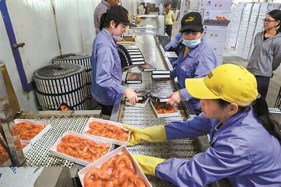 ■一筐筐鲜活虾从小货车上卸下,继而进入蒸煮、分拣、包装车间,最后以盒装熟食方式呈现。 |