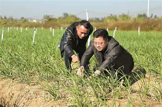 ■怀集县乡村振兴局副局长植才科(右)在“书记田”查看韭菜长势。 |