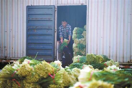 ■李纯金选购的韭菜,次日即可抵达外地各大食品厂,成为美味水饺的馅料。 |