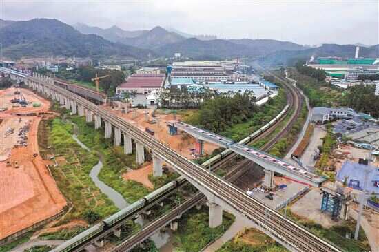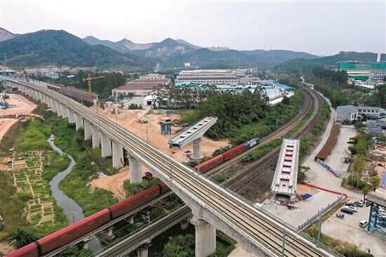 昨日凌晨,清远磁浮旅游专线银盏特大桥的双幅转体梁实现精准对接,银盏特大桥跨越交通大动脉京广铁路,与广清城际轻轨平行。此次对接的两座转体梁分别长68米、重4000吨,在京广铁路上方20多米的高空同步旋转了71度,对接用时90分钟。新华社发
