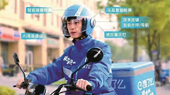 ■智能头盔能与手机相连,骑手在送餐时可以直接通过语音指令处理订单信息。 |