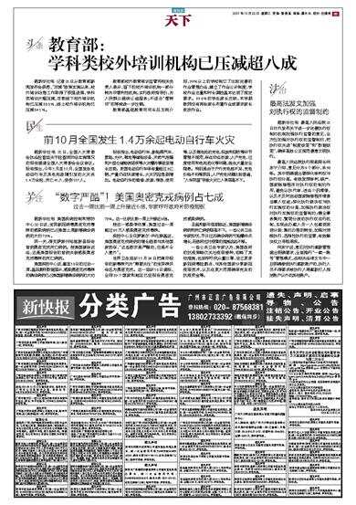 据新华社电 21日,全国人大常委会执法检查组关于检查消防法实施情况的报告提请全国人大常委会会议审议。报告指出,今年1月至10月,全国发生电动自行车及其电池故障引发的火灾共1.4万余起,死亡41人