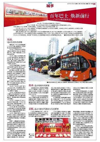 ——广州巴士集团揭牌成立 1915年,广州无轨电车筹建开始,上世纪50年代,广州的第一条公共汽车线路1路车从东山缓缓驶向黄沙,贯穿城东城西,从东山百货大楼到上下九“买好嘢”,引领时尚潮流。