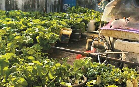 ■经过半年多的打理,林伯在楼顶开辟的菜园已初见规模,绿油油的菜园也成为猫咪的领地。 |