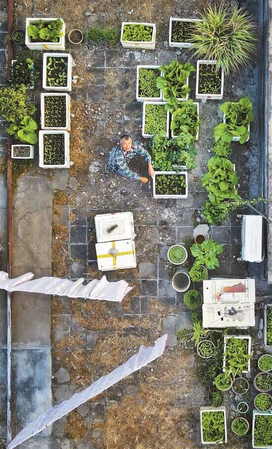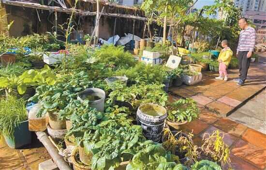 生活在喧嚣的城市, 寸金寸土。和家人一起, 在楼顶开辟一个菜园子, 喝茶、 种菜、 养花……悬浮在钢筋水泥之上,生活一样可以写意。楼顶, 成了城市上空的一道风景。 ■新快报记者 夏世焱 摄影报道 冬至刚过,广州又迎来一个晴天,阳光穿过一片薄薄的云层斜射在远处的广州塔和珠江新城高楼上,给城市涂上了一层金色。 小区楼顶,张叔晾完最后一件衣服,便蹲下身来,小心翼翼地查看着脚下花盆里菜苗的生长情况。前两天下了一场小雨,气温也急剧下降,张叔当时还有点担心,没想到今天太阳就出来了,七八个花盆里的菜苗都长得不错,嫩绿的叶尖上还闪烁着露珠,这让张叔的心情变得很好。 旁边的十几个花盆里种的是白萝卜,因为长势太好,萝卜已经露出了花盆一大截。前两天一家人就已经尝过鲜了,大概因为是自己亲手种的,张叔总感觉味道比菜市场买回来的都要好。冬至过节当天,他还特意拔了好几个萝卜送给楼下的邻居。“好东西就要大家一起分享。”张叔笑着说。 这是位于广州海珠区滨江路附近的一个普通小区,和张叔一样,很多住在顶楼的居民自发地将自家对应的楼顶改造成了一个个小菜园。利用有限的空间,不仅体验了一把“采菊东篱下,悠然见南山”的田园生活,也给城市增添了一份绿意。 为了鼓励市民自愿自主利用门前屋后、阳台、房顶等空地建设“小菜园”,今年3月27日,“广州城市小菜园”工程在广州花城广场举办启动仪式,这也是全国首次由政府引导社会参与建设“个人专属菜园”的城市行动。 “我从小是在农村长大的,后来到了大城市工作,平时只有周末有时间种种花草,现在退休了,就想着能有一块地方可以种种菜,重温一下童年时光。”今年4月份碰巧在网上看到“广州城市小菜园“的新闻,张叔就再也坐不住了。张叔家住在小区顶楼,楼梯可以直上天台,但因为长期没人打理,楼顶早已荒废,不仅长满杂草,还堆满了各种废弃物。张叔拉着老伴一起,花了整整两天的时间,把所有的东西都清理干净,再把家里搁置的各种花盆,一个个搬到楼顶,整齐地摆放在一起,连成了一片小小的菜地。 “你别看这个花盆只有脸盆这么大,里面可以种出三四个大萝卜。”经过这几个月的实验,张叔现在已经有了足够的经验和自信。但刚开始种植的时候,他心里也没有底。第一次种菜,他在花盆里撒了好多西红柿种子,好不容易等到发芽了,最后还是没有成活,上网查了资料,原来是季节不对。 “种菜和种花不一样,得讲究时令。如果没把握好,很可能什么也种不出来。”现在的张叔俨然是一个地道的菜农。什么时候播种,什么时候浇水,什么时候施肥,都一清二楚。技术提升以后,张叔开始扩大“规模”。以前自家的废弃花盆已经不够用了,他就到小区邻居家去“淘”,慢慢积累下来,现在菜园里已经有几十个各种规格和材质的花盆。有了足够的空间,就可以种上不同种类的蔬菜。“现在一家人的蔬菜已经完全可以自给自足了。”张叔笑着说。 每天早晚,张叔都会到菜园子里打理,生活变得充实而有规律。为了方便购买种子、肥料、工具,他学会了网购,时不时还在朋友圈里晒一晒自己的劳动成果。他觉得,这样的生活充满了乐趣。
