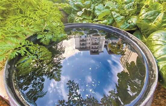 ■蓝天、白云、楼房和菜园子。林伯种菜用的盆是邻居家淘来的,水桶也是装修工人丢弃的,“算是废物利用了”。 |
