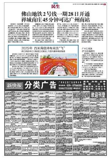 佛山地铁2号线一期28日开通 禅城南庄45分钟可达广州南站