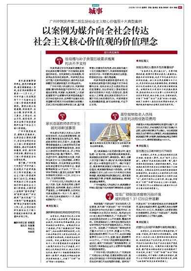 广州中院发布第二批弘扬社会主义核心价值观十大典型案例 家长造谣教师体罚学生,被判寻衅滋事罪;高空抛物致老人伤残,法官判决赔偿各项费用……1月4日,广州市中级人民法院发布了十个弘扬社会主义核