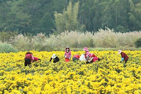 ■2021年11月底,在河源江东新区临江镇年丰村的中草药种植示范基地里,成片的金丝皇菊正灿烂盛放,迎来采摘季。 |