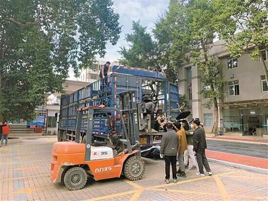 ◀万家乐公司捐赠的新办公桌椅装车,准备发往古水镇。 |